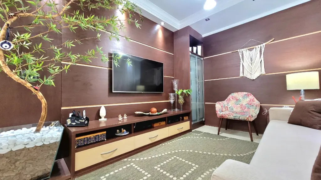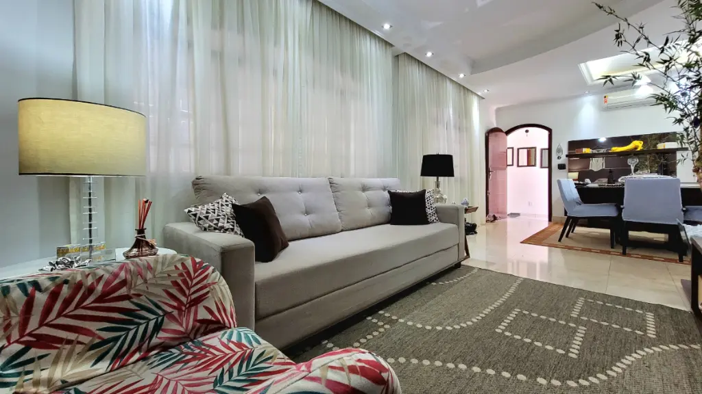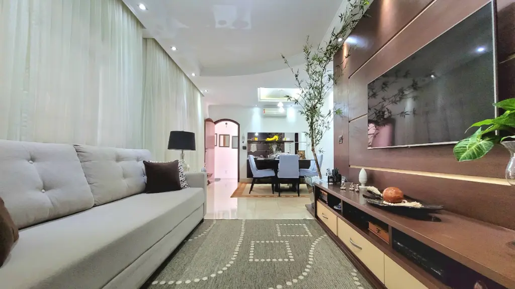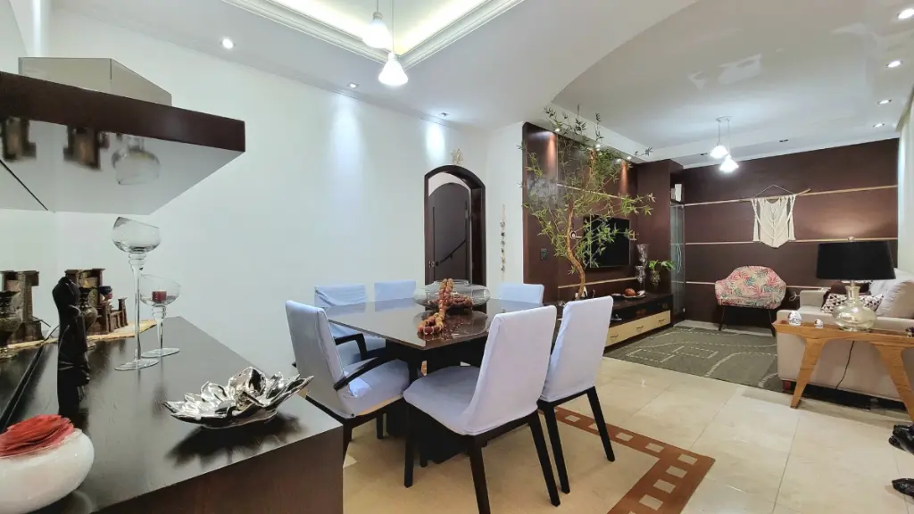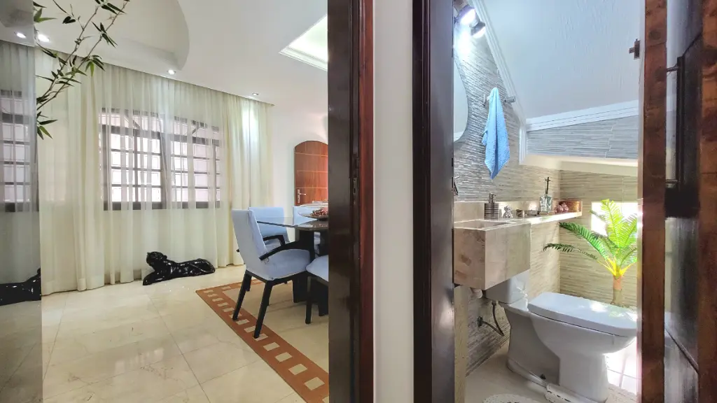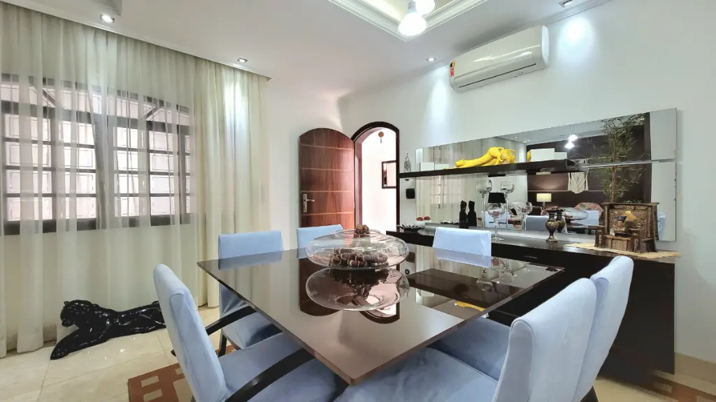 No térreo, as salas de jantar e de visita contam com piso de mármore, proporcionando um ambiente refinado e acolhedor. Ambas com ar-condicionado ciclo reverso, perfeitas para momentos em família ou para receber convidados com charme e conforto.