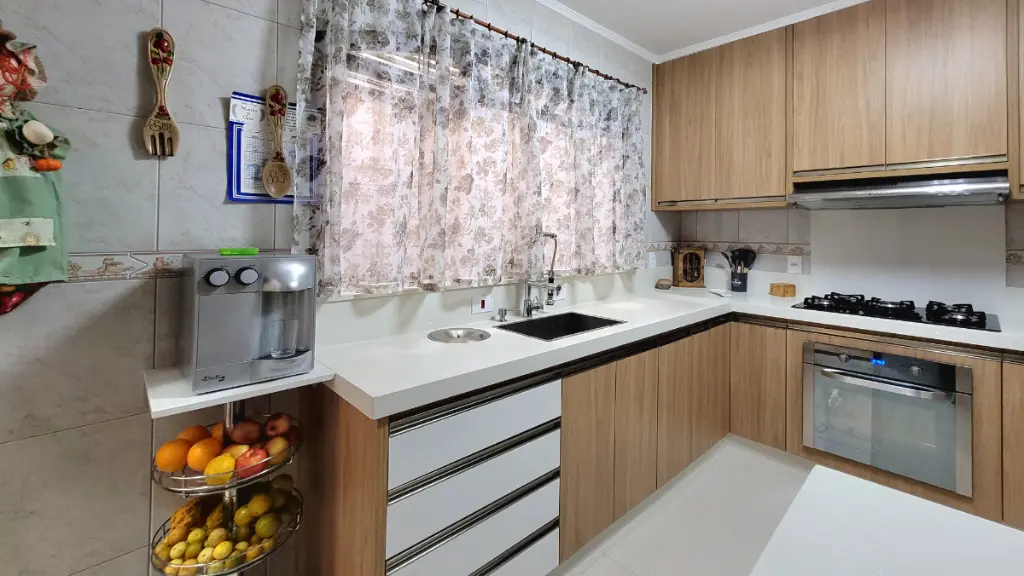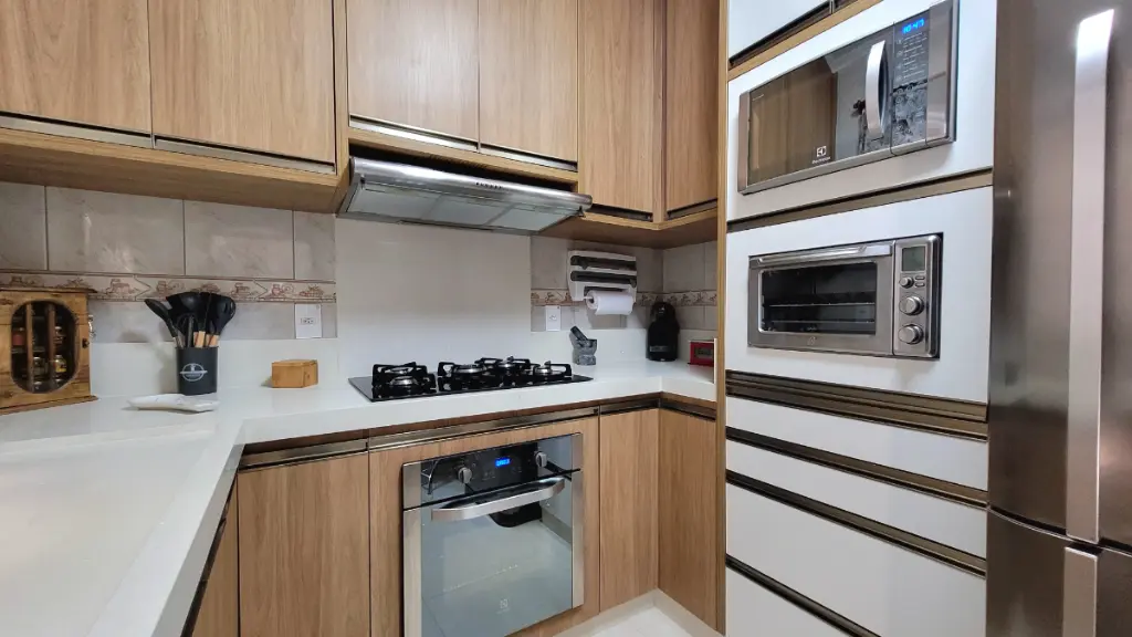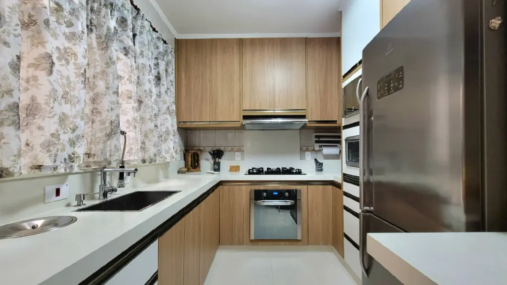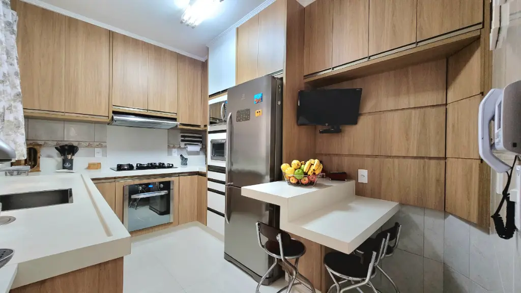 A cozinha é um destaque à parte!! Equipada com pia em mármore importado, torneira gourmet, além de lixeira embutida e armários planejados une design e bom gosto. A mesa, na mesma pedra, perfeita para o café da manhã e refeições rápidas, proporciona praticidade.