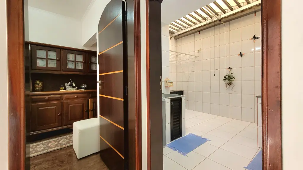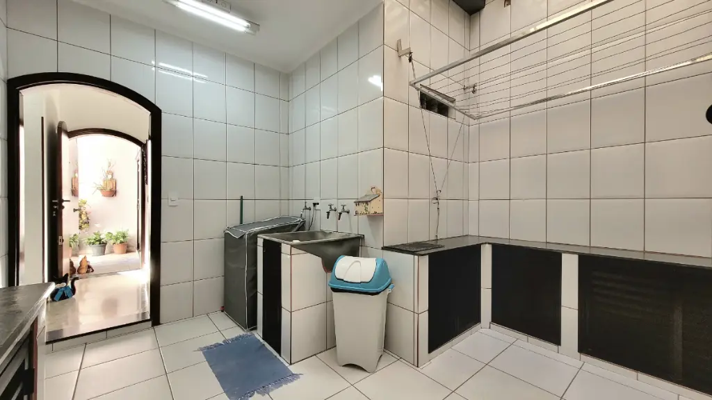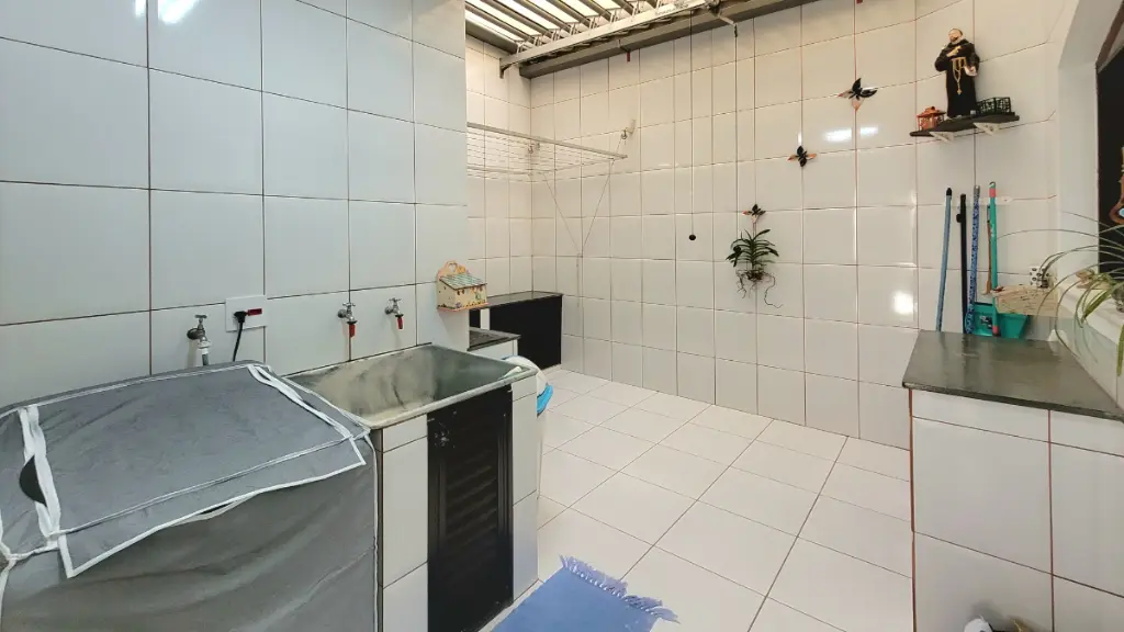A lavanderia possui cobertura Zetaflex, ideal para aproveitar o espaço com funcionalidade e permitir a incidência do sol.