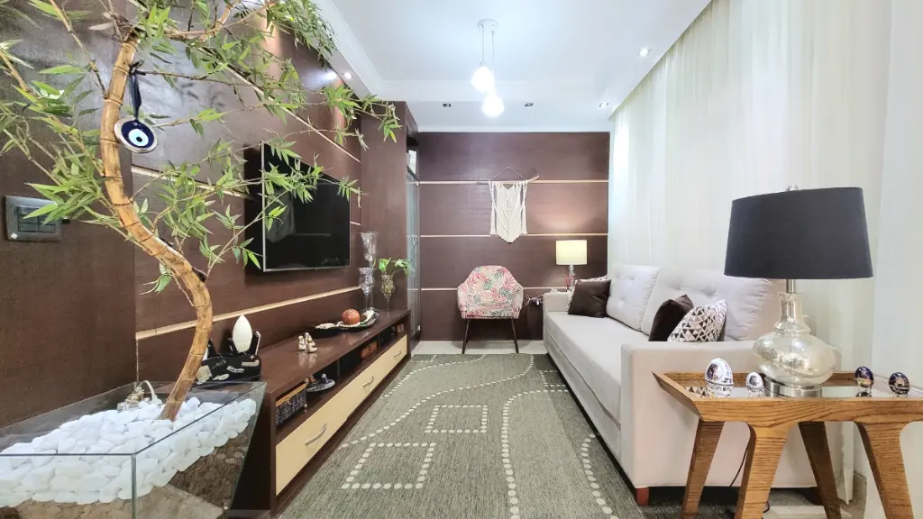 1 suíte (chuveiro, box de vidro e gabinete), com armários planejados, ar condicionado e varanda, proporcionando conforto e privacidade.