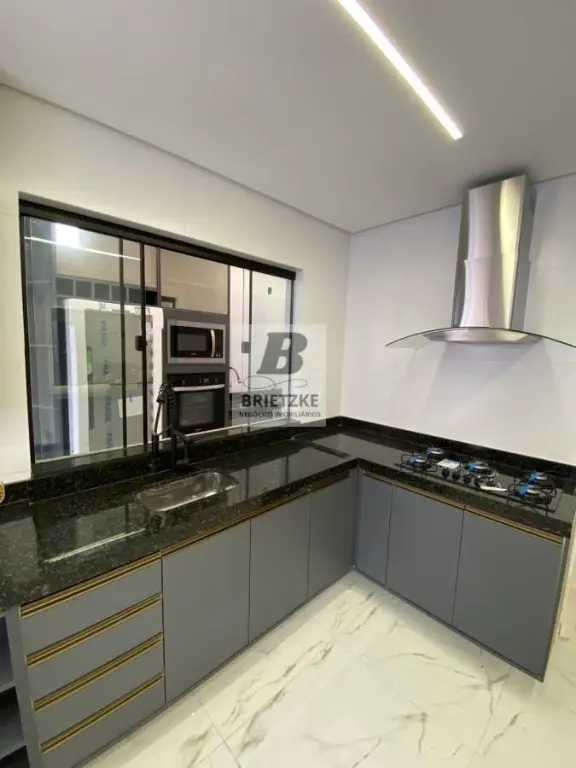 Cozinha Completa com Excelente Iluminação contendo Pia, Armários, Cooktop, Geladeira, Microondas e Forno
